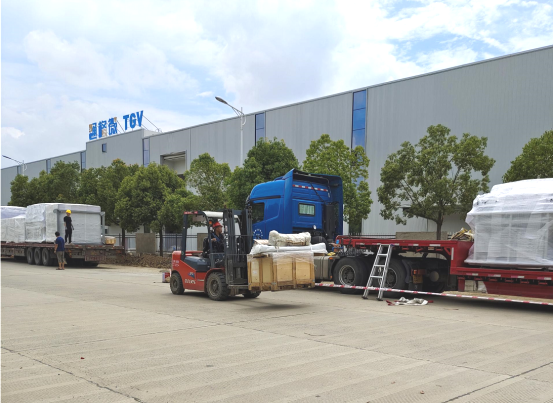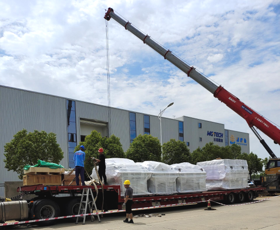 走进通格微天门基地内,数台大型拖挂车和吊装设备车辆正紧张有序地将生产设备进行卸车和转运至厂房内。据负责基地工程项目的王经理介绍,此次进场的设备是通格微整条PVD镀膜线,由多台高端机器设备组成,属于通格微和设备供应商联合定制开发,组装完成后长达40多米,所以作业难度很大,工人们操作起来也特别谨慎。