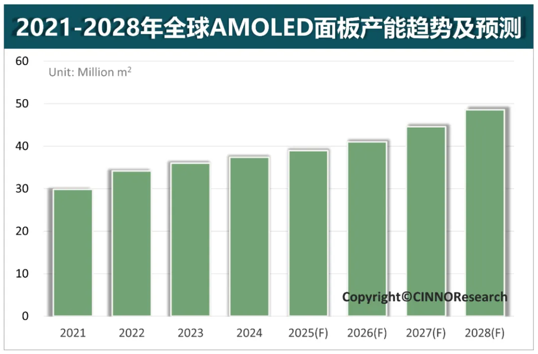 图示:2021-2028年全球AMOLED面板产能趋势及预测 来源:CINNO Research